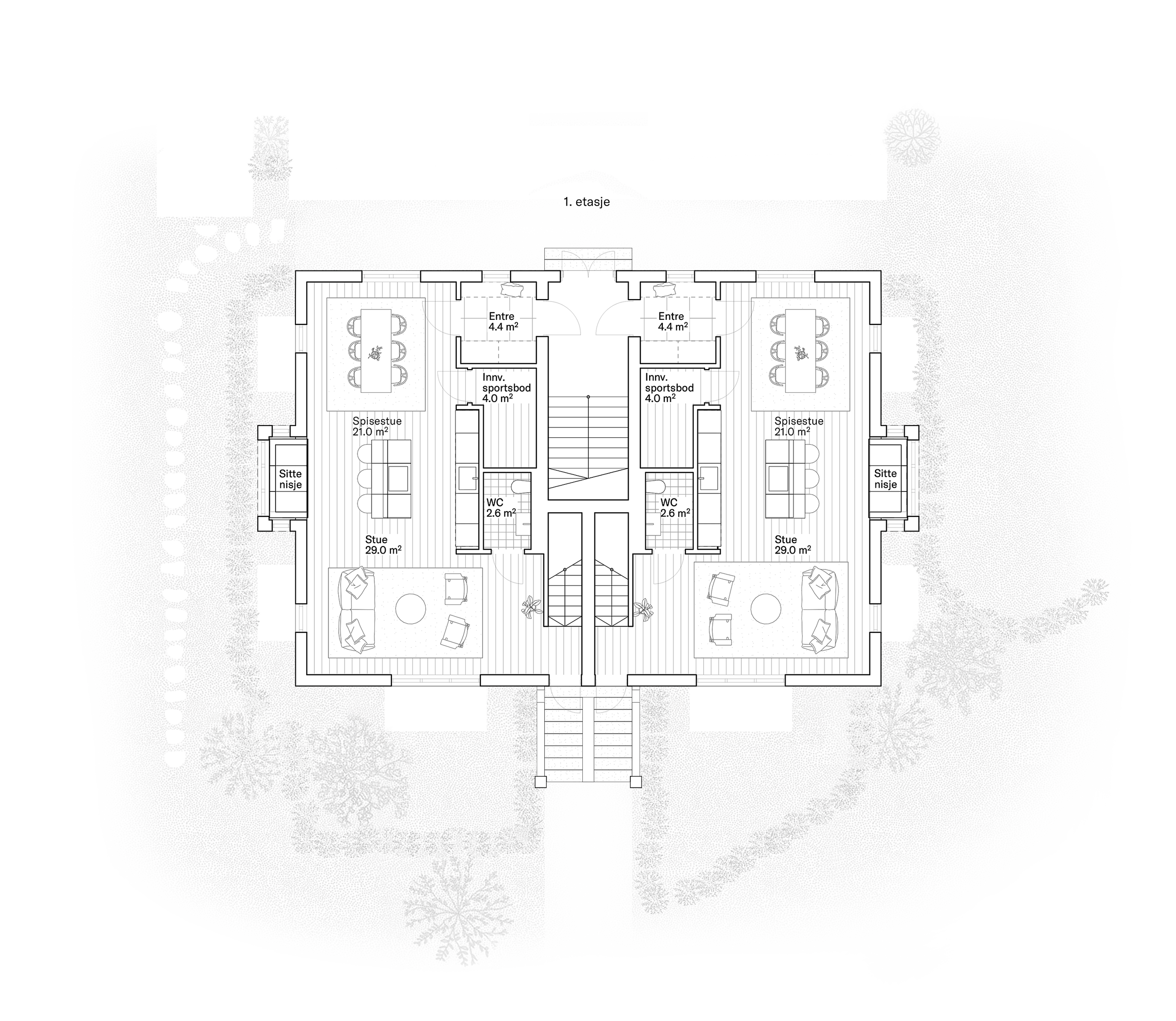 The symmetrical plan consists of four apartments between 120-140 m2 with a common entrance towards the North. Each apartment has access to private outdoor areas as well as a common garden in the South.